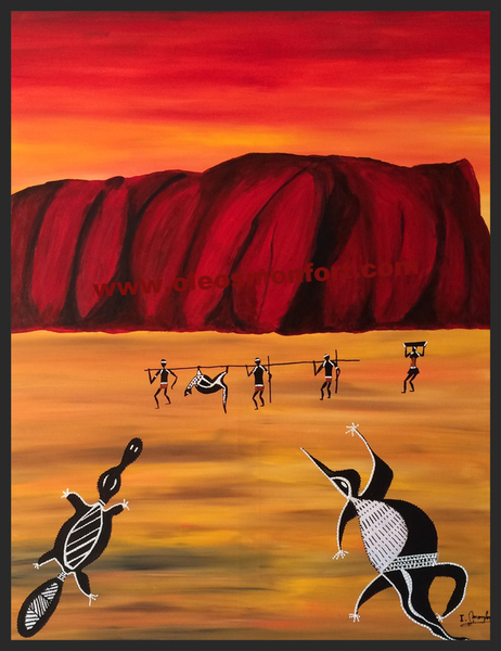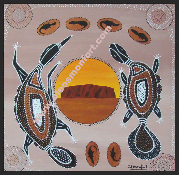 cromática en colores, tales como el amarillo (el Sol), marrón (el suelo), rojo (arena del desierto) y blanco (las nubes y el cielo) azules ( agua marina, pozos y ríos) y el tierra del monte Uluru